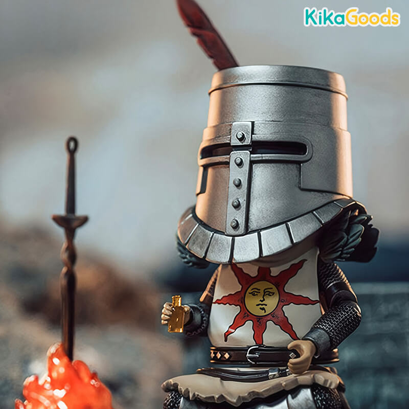 Product Contains: Solaire of Astora mini-figure, replaceable lower body, 3 pairs of replaceable hands, thunder spear, 2 sun swords, scabbard, scabbard with belt, sun shield, bottles, sun talisman, sun bug, bonfire, wall accessory, base support