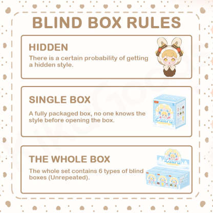 【No Box】indicates that the blind box products are sold without the original packaging box. Each item includes a doll packaged in a sealed bag, along with an identity card and a hanging rope.